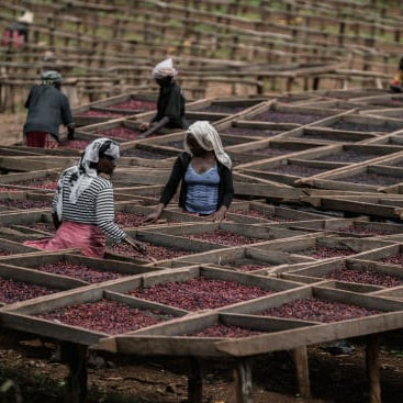 In Ethiopia, natural coffees are typically delivered the day they are harvested, and are first sorted for ripeness and quality before being rinsed clean of dirt. Then they are spread on raised drying beds or tables, where they will be rotated constantly throughout the course of drying. Drying can take an average of 8–25 days, depending on the weather.
